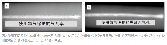 傳統的弧焊工藝使用氬氣作為不銹鋼和鋁的保護氣體,以防止焊接熔池氧化。激光焊接使用氮氣提供更好的焊接結果。使用氮氣和氬氣作為保護氣體的焊接結果如下所示(圖2)。