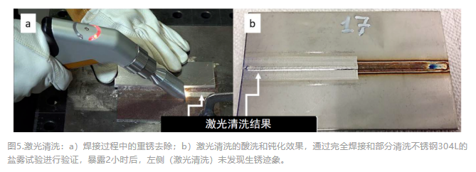 激光清洗最重要的優勢之一是焊接后不銹鋼酸洗和鈍化。圖5b顯示了浸入35℃鹽霧溶液(Morton Culinox 999/DI Type IV)中2小時后的樣品。焊后對樣品左側進行激光清洗,右側保持焊接狀態。焊接樣品右側發現明顯的生銹跡象,但是在激光清洗后,左側未發現生銹。該示例證明了激光清洗可以取代不銹鋼應用的傳統酸洗和鈍化過程。