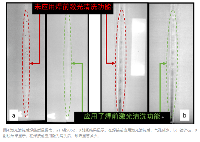 LightWELD XC手持激光焊接清洗一體機具有激光光斑尺寸小和高頻脈沖控制特征,可以針對焊接前后發生變色和污染的表面提供清洗功能。由于氧化層和污染物會對氣孔率和焊縫質量產生顯著影響,該功能對于鋁等材料的焊接至關重要。在傳統工藝中,操作員在焊接前使用丙酮或其他化學物質清洗接頭。激光可以燒蝕所有污染物并去除氧化層,例如,圖4顯示了激光清洗如何提高鋁5052和鍍鋅板的焊縫質量。