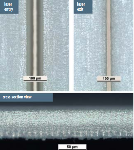 圖1用類星體UV80激光切割50μm厚的裸LCP。入口(左上角)、出口(右上角)和橫截面(底部)視圖顯示了卓越的質(zhì)量和最小的過度加熱。