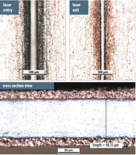 圖2用類星體UV80激光切割的厚覆銅LCP。入口(左上角)、出口(右上角)和橫截面(底部)視圖展示了通過時間定制的ns脈沖實現(xiàn)的干凈、高質(zhì)量的切割。
