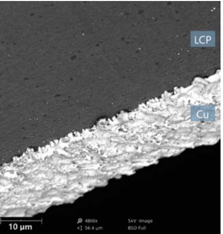 特別值得注意的是LCP切割邊緣的光滑度和垂直度,沒有明顯的“桶裝”或從銅鋪管機的切割邊緣拉回。高度放大的界面SEM視圖如圖4所示,并確認(rèn)LCP和Cu層之間的結(jié)合得到了很好的保留。更詳細(xì)的細(xì)節(jié)還顯示了光滑平坦的LCP表面,沒有任何從切割銅邊緣拉回的痕跡。
