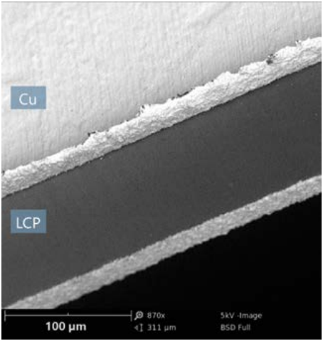 圖4 SEM特寫圖顯示,激光切割后,銅LCP完全完好,沒有LCP從銅切割邊緣拉回。