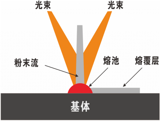 中心送粉技術(shù)簡(jiǎn)稱光包粉技術(shù),即熔覆頭中心設(shè)有單束粉末通道,激光束圍繞金屬粉呈周圍環(huán)狀分布或者多束周向環(huán)繞分布。實(shí)際工作中,金屬粉自中心通道在重力及氣動(dòng)的作用下輸出,外圍激光與金屬粉在基體上方相交于一處,處于中心位置的金屬粉被激光光束環(huán)繞充分吸收光能量成為熔融或者半熔融狀態(tài),之后熔融狀態(tài)的金屬粉落入基體表面的熔池,在基體表面形成平整致密的冶金熔覆層。