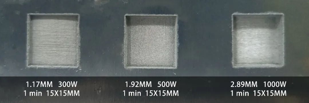 為了粗略測試1000W MOPA激光器,基本性能,我們進行了對比實驗。實驗配置F160焦距的場鏡,在鋁材上進行一分鐘的15mm*15mm面積深雕,分別使用公大激光的300W 、500W 和 1000W MOPA 進行對比測試。分別測試了,采用正焦深雕和Z軸同步移動兩種方式,測試結果見下: