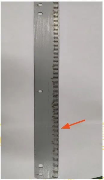 生產(chǎn)過程中,有時(shí)會(huì)使用TK機(jī)械手輔助取出切割完成的制品,這樣能更好地節(jié)約人力物力,實(shí)現(xiàn)設(shè)備的全自動(dòng)化生產(chǎn)。但是在使用TK機(jī)械手取出制品時(shí)需要注意,要控制好制品的取出順序,避免板材因強(qiáng)度減弱、材料晃動(dòng)產(chǎn)生切割波紋。如果先選擇將板材兩端制品取出,再將板材中間的制品取出,這樣就會(huì)造成板材兩端的應(yīng)力被釋放,板材強(qiáng)度不足,當(dāng)加工程序進(jìn)行到板材中間位置時(shí),板材勢(shì)必會(huì)因強(qiáng)度不足而產(chǎn)生晃動(dòng),造成制品的切割波紋,如圖9所示,且產(chǎn)品不良率較高,加工損失較大。如果從遠(yuǎn)離夾鉗一側(cè)將制品依次取出,這樣可以很好地保證加工位置板材應(yīng)力集中,運(yùn)動(dòng)穩(wěn)定,避免產(chǎn)生切割波紋,如圖10所示。因此在加工編程時(shí),要保證被取出的制品從遠(yuǎn)離夾鉗一端依次進(jìn)行,這樣可以很好地保證板材強(qiáng)度,避免板材在運(yùn)動(dòng)過程中因強(qiáng)度不足而產(chǎn)生晃動(dòng),從而避免切割波紋的產(chǎn)生。
