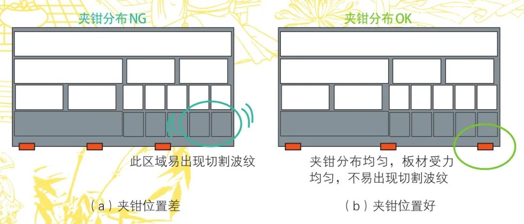 夾鉗的作用,其一就是夾持板材隨著加工程序進(jìn)行X、Y方向的運(yùn)動(dòng),其二就是保證板材在加工運(yùn)行過程中的穩(wěn)定性。因此,要合理分布夾鉗夾持板材的位置,做到夾鉗分布均勻,避免夾鉗偏向一側(cè)導(dǎo)致板材不穩(wěn)定產(chǎn)生晃動(dòng),導(dǎo)致切割波紋的產(chǎn)生。夾鉗夾持位置對(duì)比如圖8所示,此因素對(duì)切割波紋雖有一定影響,但屬于操作過程中可避免的影響因素。