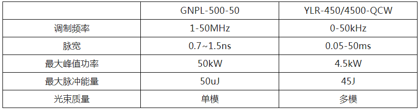 表2QCW500W綠光光纖激光器vs. QCW 450/4500紅外光纖激光器