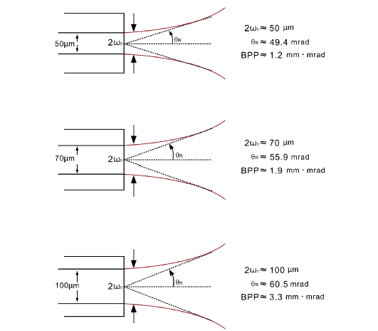 創鑫的萬瓦高亮度激光器,采用小芯徑輸出光纖配合小NA實現了高光束質量(小BPP),對主流萬瓦激光器BPP≈纖芯半徑*等效NA,如選用50μm芯徑輸出,其BPP為1.2(mm·mrad)≈25(μm) * 0.05(rad) ,如選用70μm輸出,其BPP為1.9(mm·mrad)≈33(μm) * 0.056(rad) ,如選用100μm輸出,其BPP為3.3(mm·mrad)≈55(μm) * 0.06(rad)(實測數據如下圖所示),不同芯徑的切換保持了相對小發散角的變化,等效NA在0.055附近,方便了切割頭的選配。