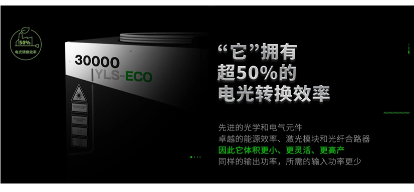 在切割市場激光器功率不斷走高的同時,另一項技術指標的天花板也被IPG再一次自我刷新。早在2014年,IPG便推出了電光轉化效率超過40%的激光器產品。2016年,這一數(shù)據被更新到50%(部分產品,部分環(huán)境下)!2022年,IPG將這一高效節(jié)能技術應用至更全面、更高功率的產品,并在中國市場正式發(fā)布YLS-ECO系列高效節(jié)能光纖激光器,宣告30kW激光器電光效率也超過了50%。IPG在光電轉化效率上刷新了行業(yè)新高度,大大降低了長期工作設備的電費成本,同時也大幅降低了激光設備的碳排放。