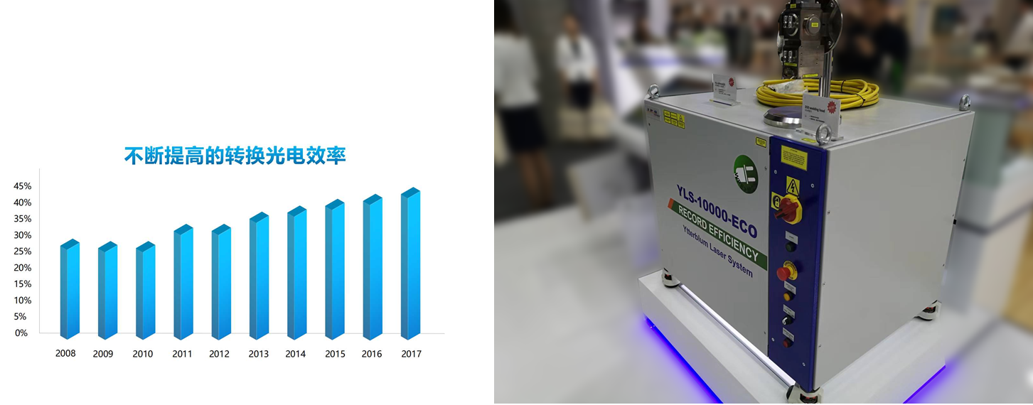 如前文所說,更高功率的工業(yè)應用推動著更高光電轉化效率的追求,IPG從2008年25%的電光轉化效率一路提升,目前已將電光效率超過50%的ECO技術推向30kW并進入工業(yè)應用。