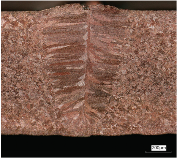 圖 5:輸出功率為 3.5 kW、焊接速度為 300 mm/s 的高亮度紅外 ARM 激光產生的銅焊縫橫截面