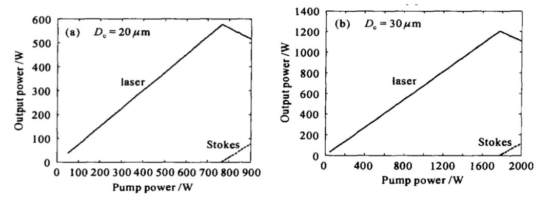 1.纖芯直徑對輸出的影響隨著抽運光功率增大到一定值時 , 光纖激光器中出現受激拉曼散射, 輸出激光功率開始減小 。在正向抽運下 , 當光纖長度一定 ( L =15 m) 時,纖芯直徑增加,SRS的功率閾值會大幅提升。為了減小受激拉曼散射的影響 , 可以采用大直徑纖芯的光纖。