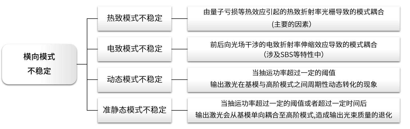 橫向模式不穩定是指高功率光纖激光在達到某一特定閾值后,隨著輸出功率提升或超過一定時間發生的由穩態基模輸出突然變為非穩態高階模式輸出,它會導致光束質量下降,限制光纖激光輸出功率的提升。嚴重情況會讓號稱 “最快的刀,最準的尺,最亮的光”的激光名不副實。