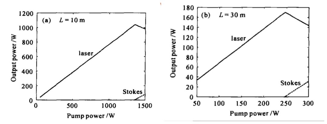 2.光纖長度對輸出的影響正向抽運下 , 當纖芯直徑一定(20μm),隨著光纖長度的增加,SRS的閾值會急劇降低。通過減小光纖長度, 可以得到較高的輸出功率。