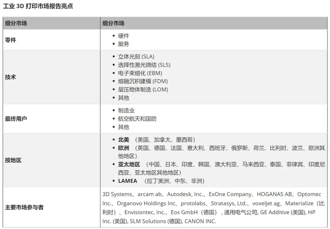 如上圖所示,報告根據(jù)增材制造用戶類型分析了增材制造市場。與其他傳統(tǒng)方法相比,這種技術(shù)提供了創(chuàng)造經(jīng)濟實惠、復(fù)雜和更輕的部件的可能性。因此,我們看到,工業(yè)部門顯然是最突出的,無論是創(chuàng)建原型、工具還是最終部件。即便如此,值得注意的是,航空航天和國防部門處于第二位,并且預(yù)計在未來幾年將繼續(xù)增長。就地區(qū)而言,北美預(yù)計在2021年將占最大份額,幾乎貢獻了總市場份額的一半。然而,拉丁美洲、中東和非洲(LAMEA)國家在預(yù)測期內(nèi)預(yù)計將實現(xiàn)24.1%的復(fù)合增長率。