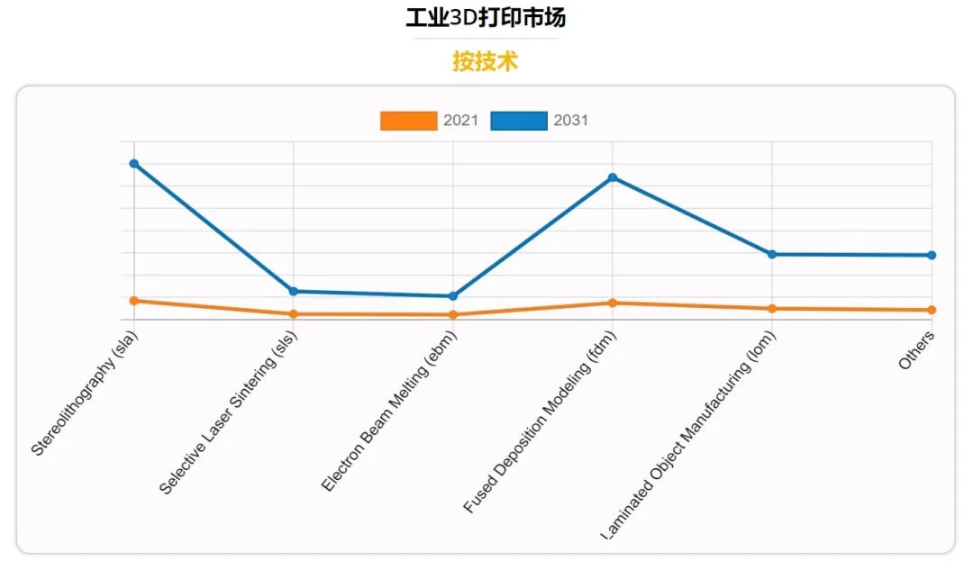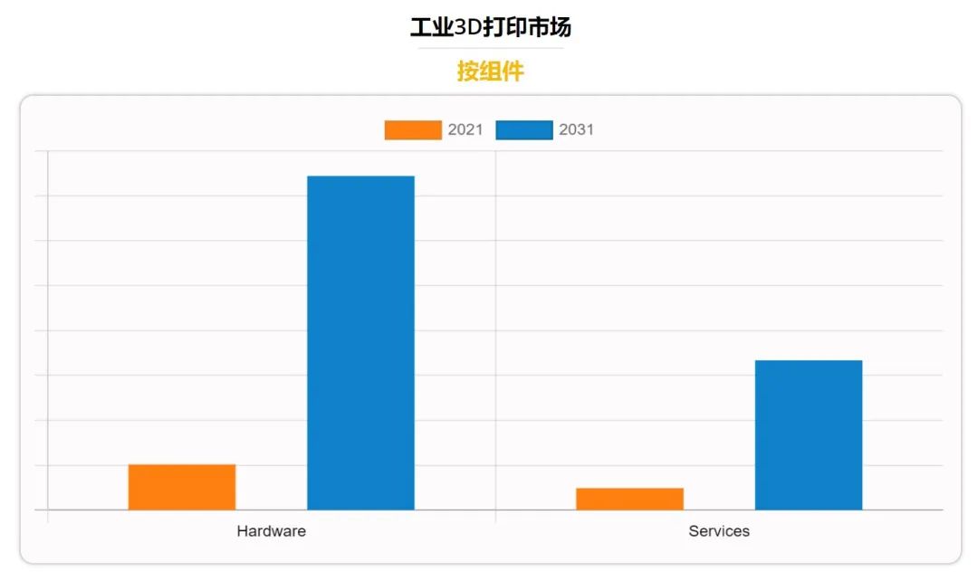 如果我們專注于3D打印解決方案本身,我們可以看到該研究強調(diào)了兩個重要方面:組件和技術(shù)。組件指的是機器運行所不可缺少的元素,即硬件和軟件。在這方面,我們可以看到,硬件部分在2021年占總份額的三分之二以上,并預(yù)計在2031年前保持其領(lǐng)先地位。另一方面,許多市場參與者使用了不同的3D打印技術(shù)。立體光刻技術(shù)(SLA)部分占據(jù)了超過四分之一的市場份額,預(yù)計在未來幾年將繼續(xù)保持領(lǐng)先地位。然而,在預(yù)測期內(nèi),F(xiàn)DM 3D打印將注冊最高的復(fù)合年增長率。