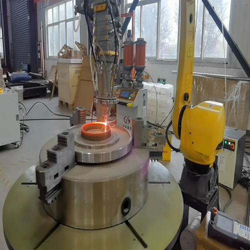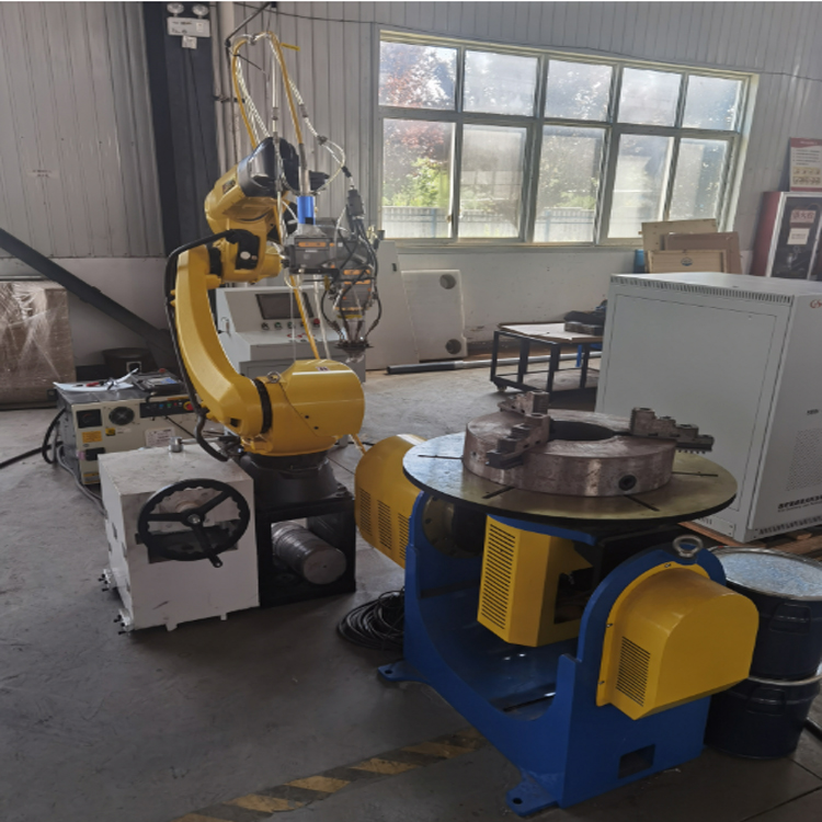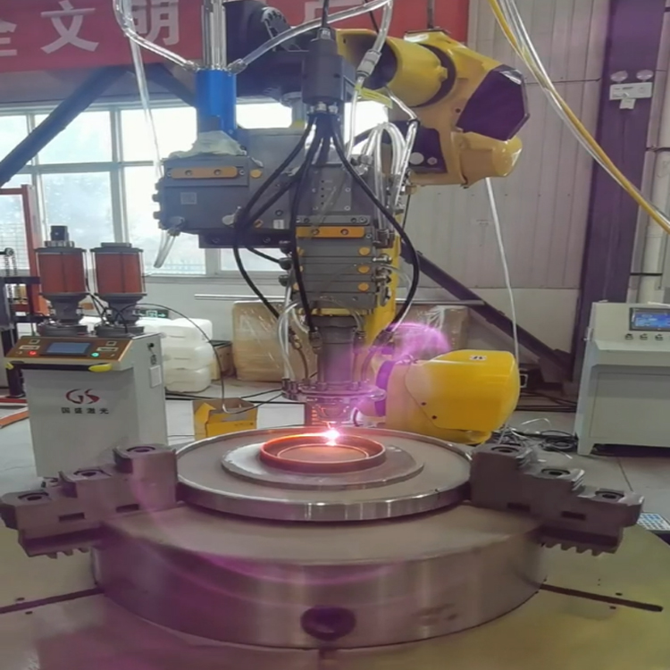 八軸聯(lián)動激光熔覆設(shè)備,是國盛激光自主研發(fā)的以機器人為運動核心,可適應(yīng)各種復(fù)雜結(jié)構(gòu),和非標(biāo)準(zhǔn)零件的激光熔覆加工系統(tǒng)。該系統(tǒng)配置靈活多樣,根據(jù)客戶應(yīng)用場景可配置不同規(guī)格的機器人,同時選配變位機、轉(zhuǎn)臺、滑臺以適應(yīng)不同加工類型工件的激光熔覆加工及表面處理。設(shè)備主要由前端執(zhí)行機構(gòu)和后端設(shè)備組成,前端執(zhí)行機構(gòu)包括機械臂、變位機、電氣控制系統(tǒng)、激光熔覆頭、熔覆噴嘴組成;后端設(shè)備包括熔覆專用激光器、熔覆專用水冷機、穩(wěn)壓電源、送粉器等。