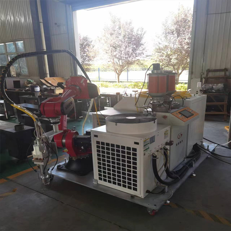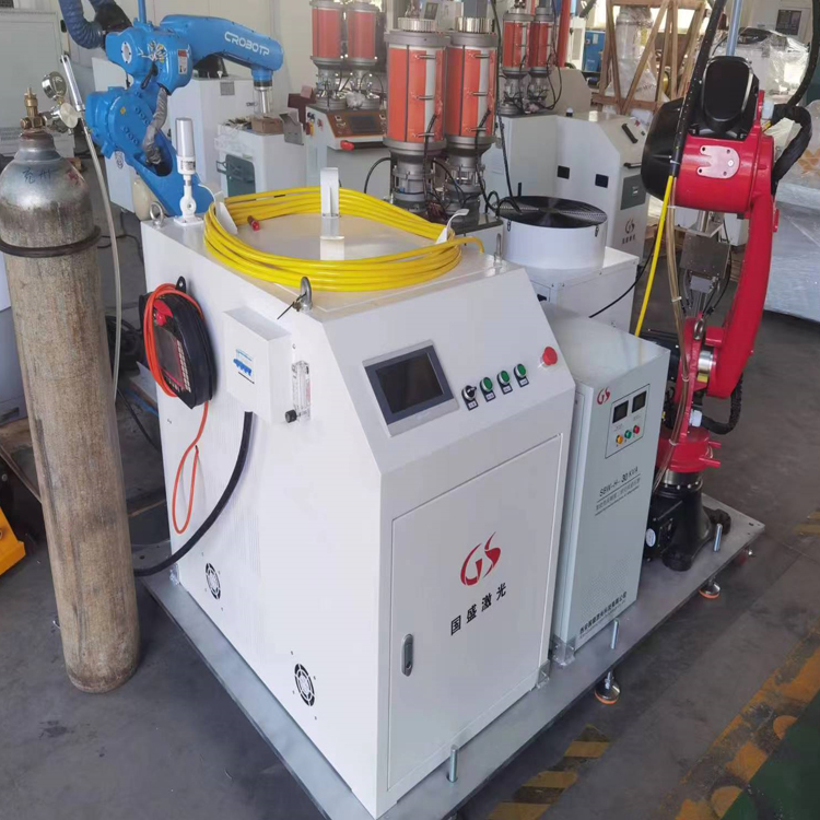 移動式激光熔覆設備主要由前端執行器和后端設備組成。前端執行器由多軸工業機器人、移動小車及電氣控制系統、送粉機構、激光熔覆頭和熔覆噴嘴組成。后端設備由高功率光纖激光器、水冷器、電源電箱和保護氣組成。移動式熔覆設備幾乎是大型設備維修現場唯一的維修選擇,尤其是對于那些無法拆卸和運輸的部件。